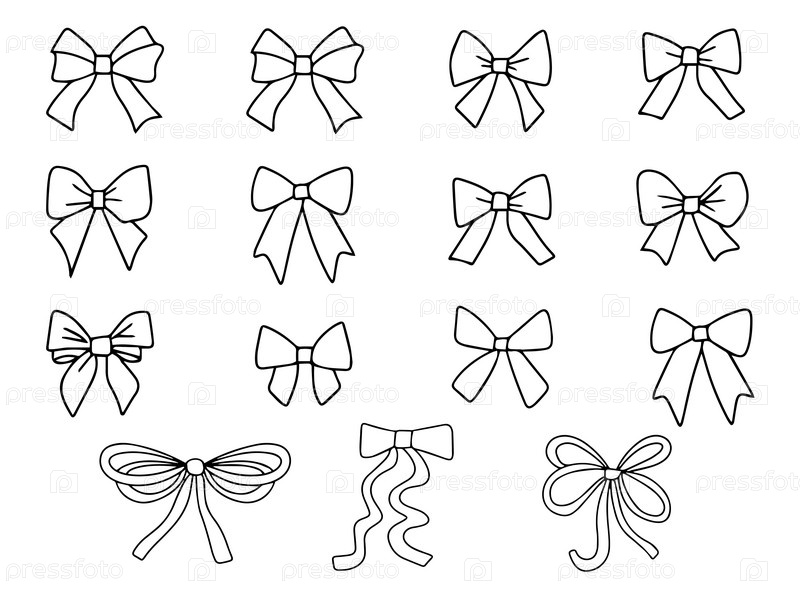 Набор элегантных мультяшных бантов на белом фоне, подарочные ленты. Модный аксессуар для плетения волос. Ленты для рисования. Ручная рисованная векторная иллюстрация