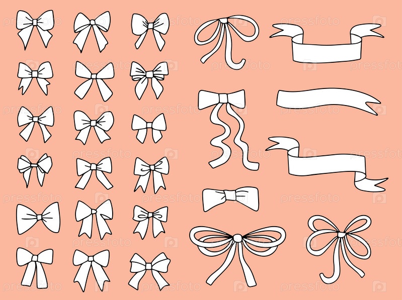 Набор элегантных мультяшных бантов на белом фоне, подарочные ленты. Модный аксессуар для плетения волос. Ленты для рисования. Ручная рисованная векторная иллюстрация