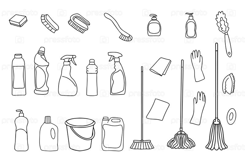 Комплект уборочного оборудования. Иконки линий очистки. Линия рисованного оборудования, чистящих средств и инструментов для мытья и дезинфекции дома, ведра и швабры, распылителя моющих средств
