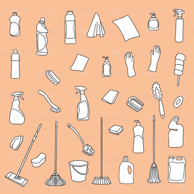 Комплект уборочного оборудования. Иконки линий очистки. Линия рисованного оборудования, чистящих средств и инструментов для мытья и дезинфекции дома, ведра и швабры, распылителя моющих средств