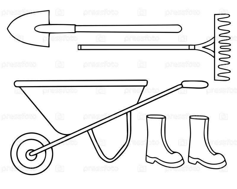 Набор садовых инструментов рисует векторные элементы. Ручная лопата, грабли, лейка, резиновые сапоги, тачка, изолированная на белом. Векторная иллюстрация