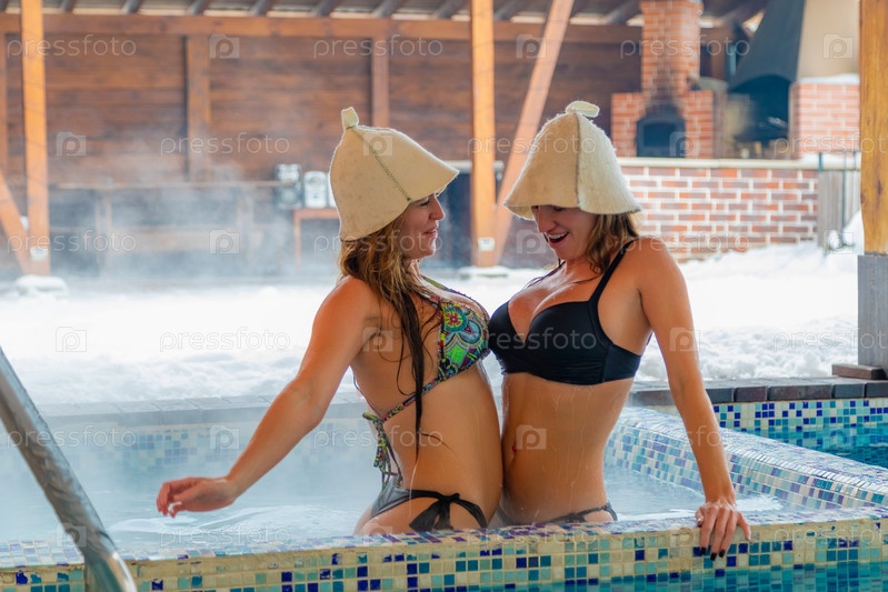 Две женщины расслабляются в бассейне в купальниках и плавках бикини, наслаждаясь водой в гидромассажной ванне для отдыха