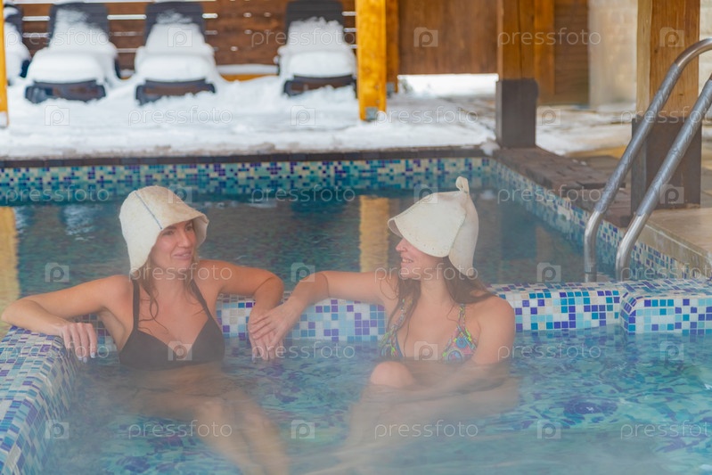 Две женщины в купальных шапочках отдыхают в гидромассажной ванне у бассейна, наслаждаются отдыхом и веселятся
