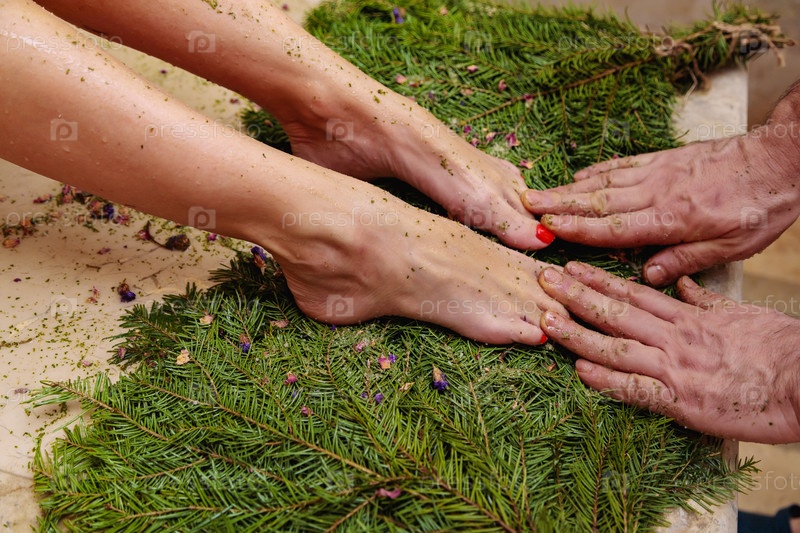 Мужская рука массирует ноги женщины большим пальцем и пальцами, а также нежными жестами по траве, обеспечивая успокаивающее и расслабляющее ощущение