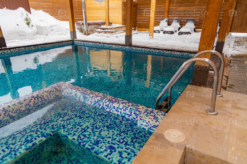 Роскошный бассейн с деревянной лестницей, приглашающий вас освежиться в лазурной воде в этом здании недвижимости