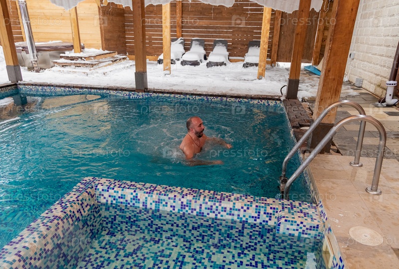 Мужчина наслаждается неторопливым купанием в заснеженном бассейне