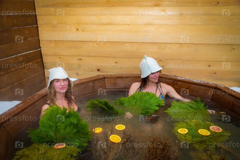Две женщины наслаждаются неторопливым купанием в деревенской деревянной ванне, окруженной безмятежным ландшафтом из травы, растений и садов