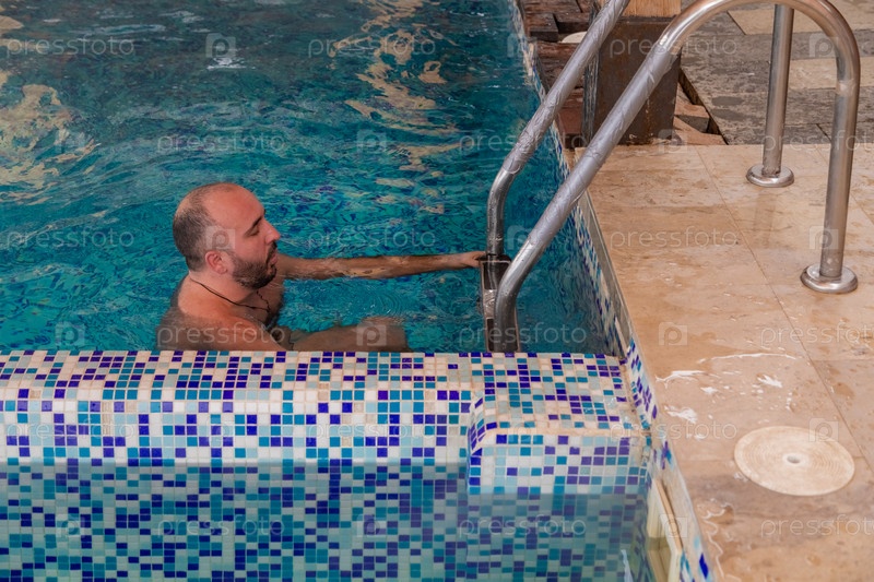 Мужчина наслаждается неторопливым плаванием в бассейне, наполненном жидкой водой, в окружении заснеженных деревянных строительных материалов и недвижимости