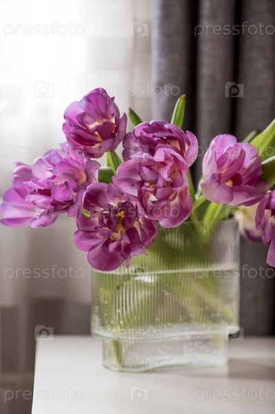 Букет розовых тюльпанов в красивой стильной вазе на столе в комнате. Концепция наступления весны и Международного женского дня 8 марта