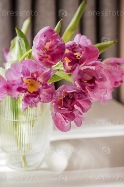 Букет розовых тюльпанов в красивой стильной вазе на столе в комнате. Концепция наступления весны и Международного женского дня 8 марта