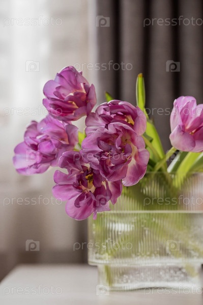 Букет розовых тюльпанов в красивой стильной вазе на столе в комнате. Концепция наступления весны и Международного женского дня 8 марта