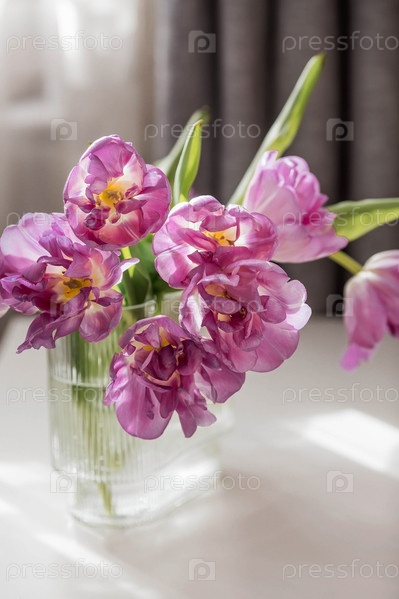 Букет розовых тюльпанов в красивой стильной вазе на столе в комнате. Концепция наступления весны и Международного женского дня 8 марта