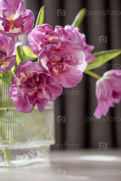 Букет розовых тюльпанов в красивой стильной вазе на столе в комнате. Концепция наступления весны и Международного женского дня 8 марта