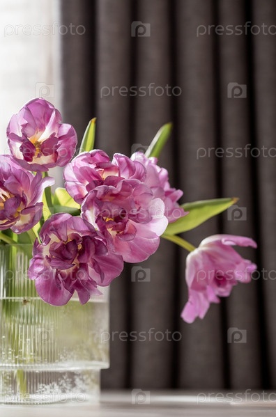Букет розовых тюльпанов в красивой стильной вазе на столе в комнате. Концепция наступления весны и Международного женского дня 8 марта