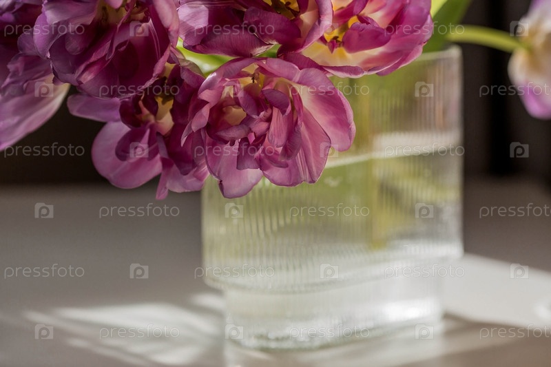 Букет розовых тюльпанов в красивой стильной вазе на столе в комнате. Концепция наступления весны и Международного женского дня 8 марта