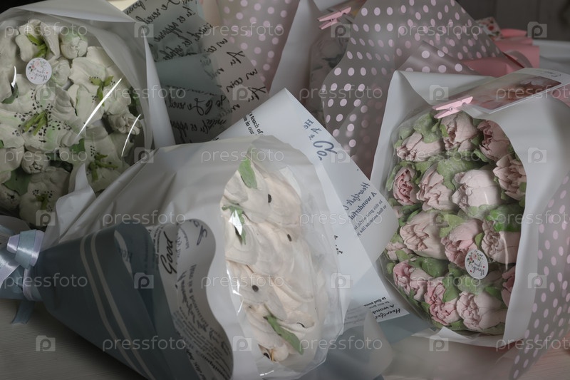 Три зефирных букета. Зефирные цветы и пельмени. Домашний зефир. Селективный фокус. Крупный план