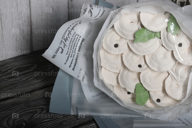 Букет из зефирных пельменей. Зефирные пельмени. Домашний зефир. на черном деревянном фоне. Место для текста