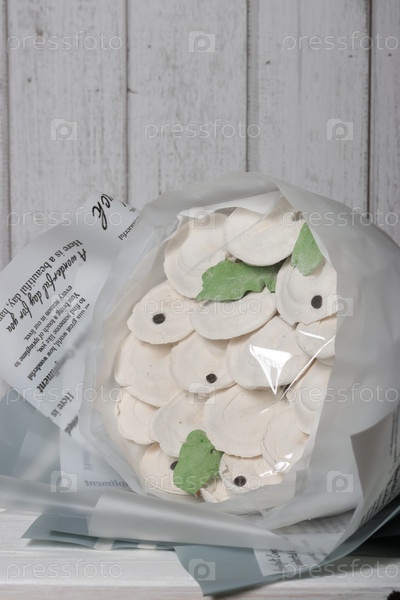 Букет из зефирных пельменей. Зефирные пельмени. Домашний зефир. на деревянном фоне. Место для текста
