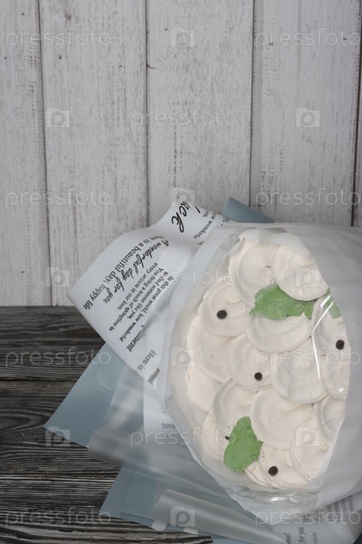 Букет из зефирных пельменей. Зефирные пельмени. Домашний зефир. на деревянном фоне. Место для текста