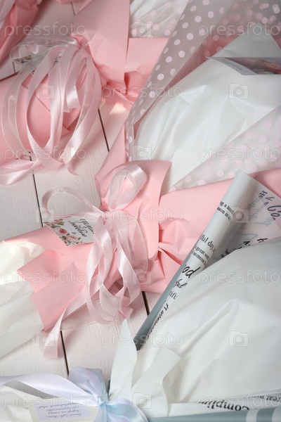 Три свадебных букета в упаковочной бумаге розового, белого и других цветов. Крупный план