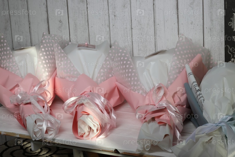 Четыре свадебных букета в бело-розовой упаковочной бумаге и других цветах