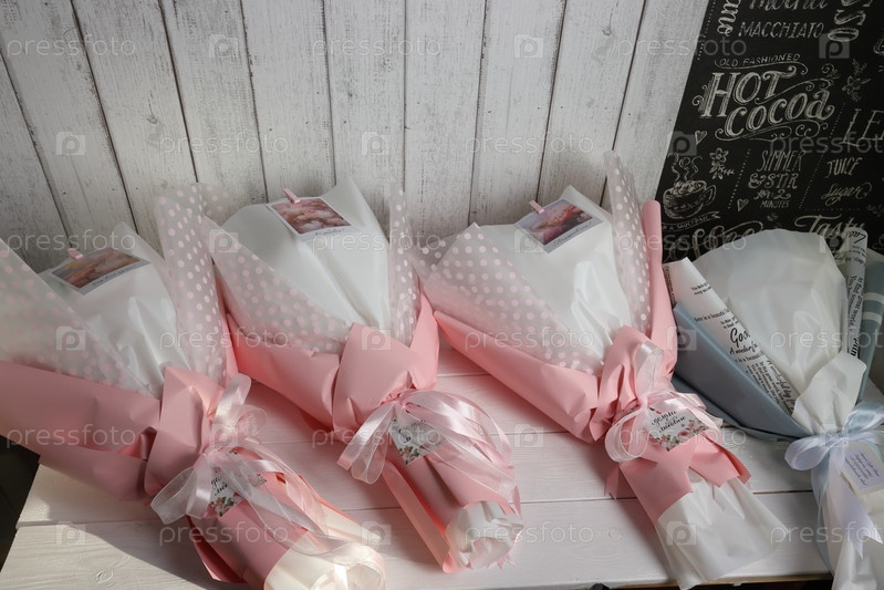 Свадебные букеты в бело-розовой упаковочной бумаге
