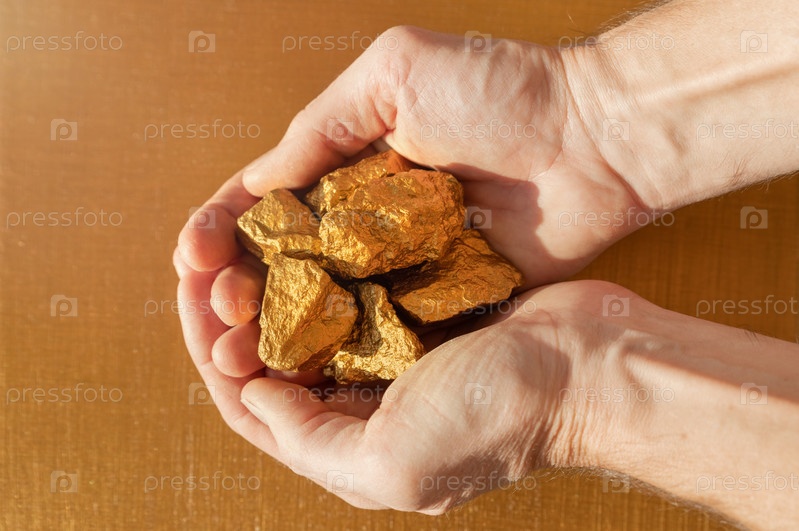 Большие золотые самородки в ладонях человека