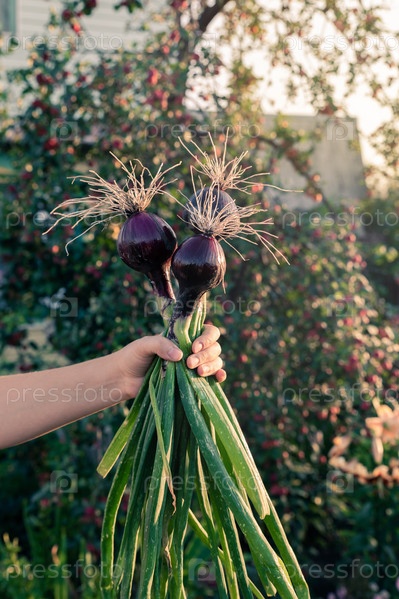 Лук в руках фермерши
