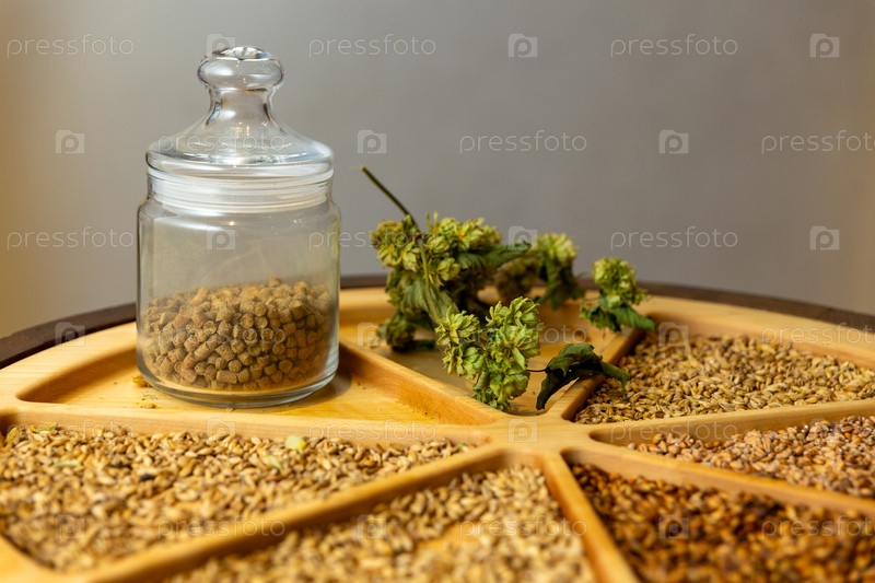 Различные виды солодового солода и сушеная ветка хмеля на деревянном подносе