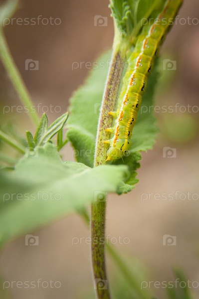 Зеленая гусеница взбирается на растение с листьями