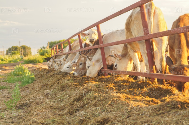 Коровы едят корм в загоне на ферме