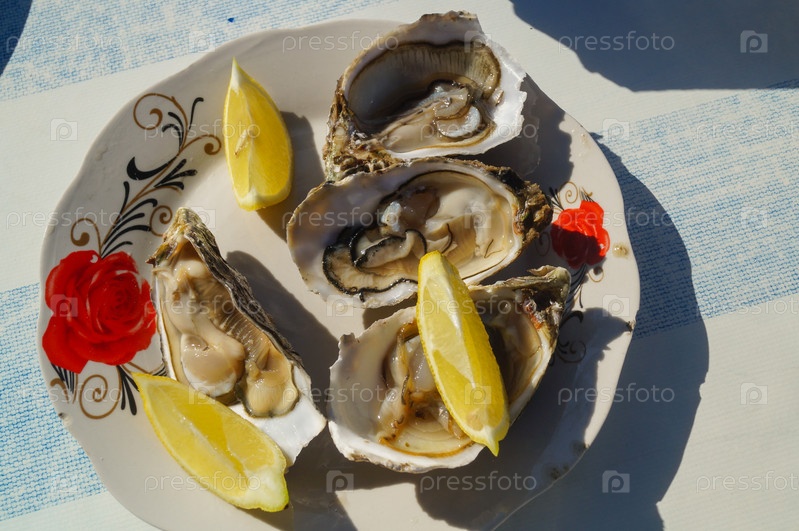 Открытые устрицы с лимоном на белой тарелке