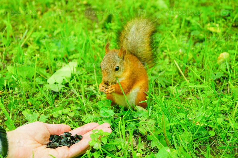 Белка ест семечки с рук