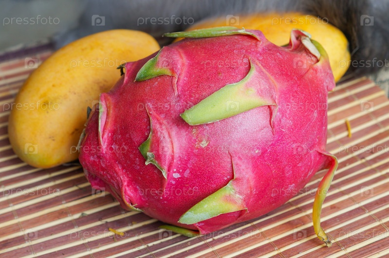 Два желтых спелых манго и драконий фрукт