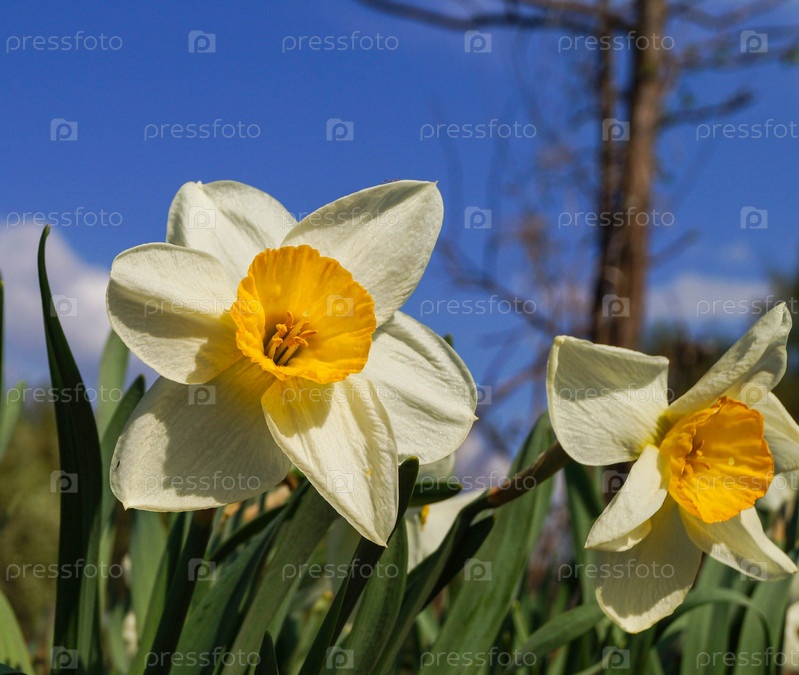 Красивые весенние цветы нарциссы на фоне голубого неба