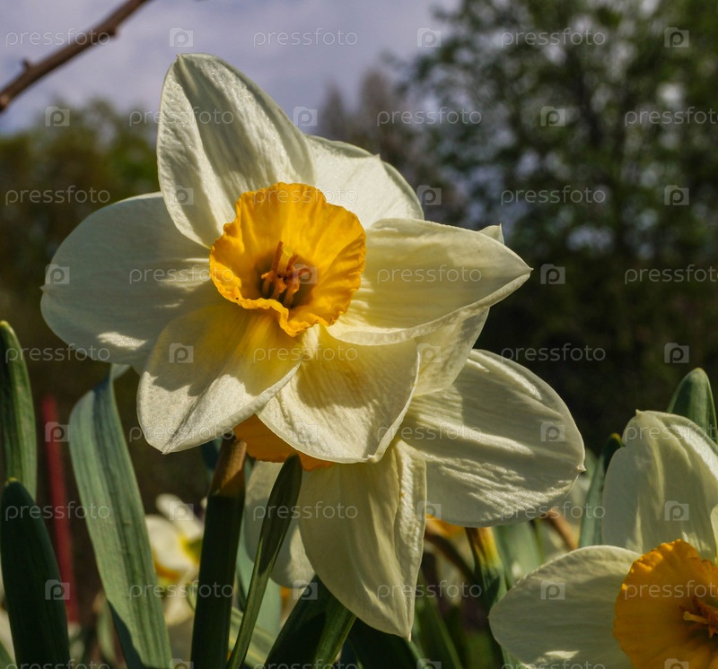 Красивые весенние цветы нарциссы на фоне голубого неба