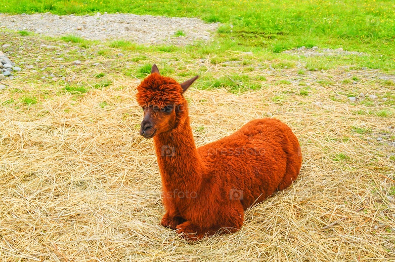 Коричневая альпака лежит на траве