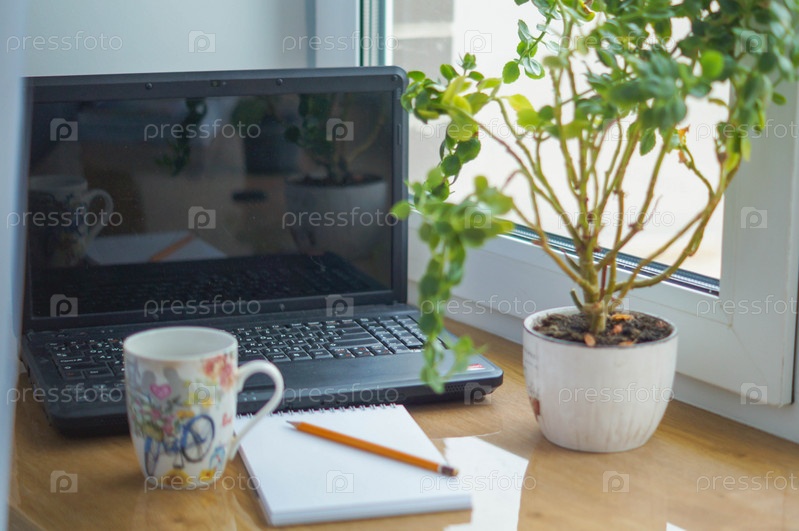 Ноутбук с чашкой кофе и блокнотом с ручкой