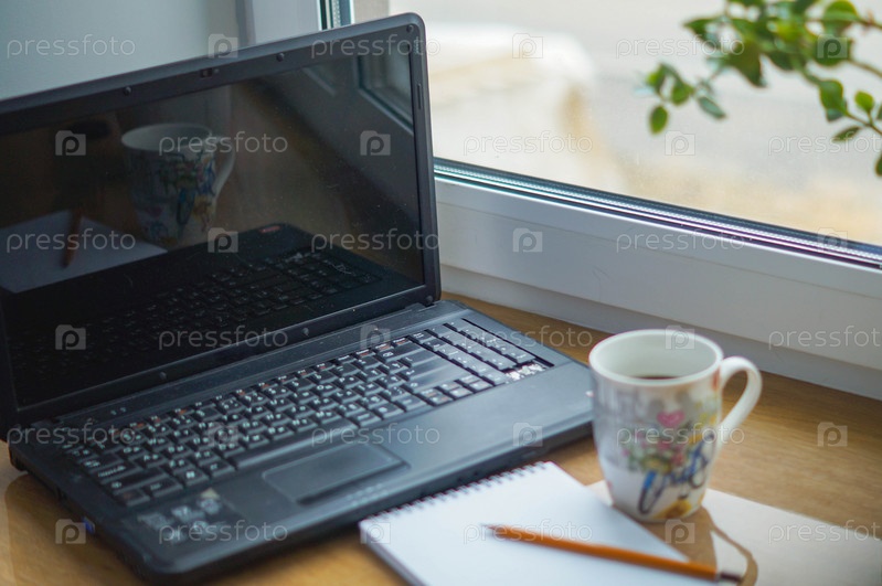 Ноутбук с чашкой кофе и блокнотом с ручкой