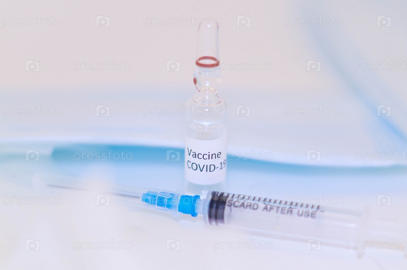 Флакон с ампулой коронавирусной вакцины вместе с инъекционным шприцем