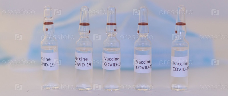 Ампулы с вакциной Ковид-19 в лаборатории на столе, шприц