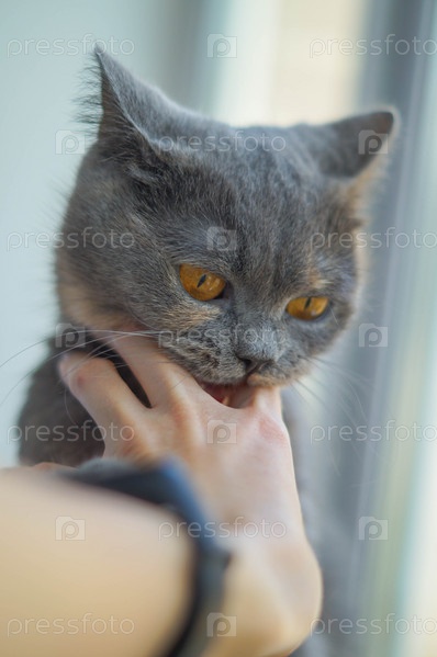 Агрессивный шотландский серый кот кусает девушку за руку