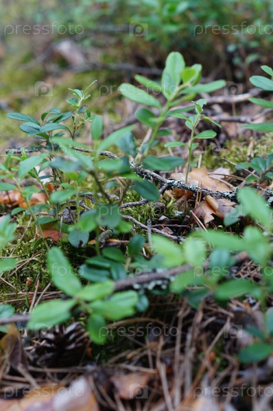 Листья брусники. Красивый фон с зелеными листьями брусники