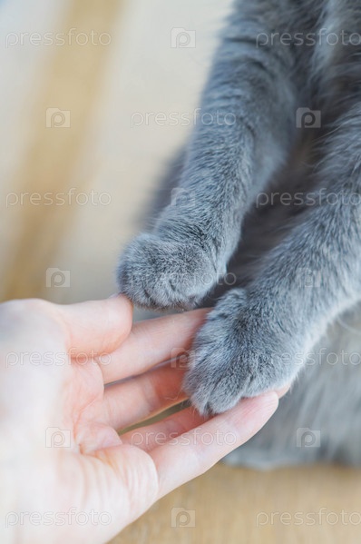 Лапа серой кошки и человеческая рука Концепция дружбы человека с домашним животным, ухода за животными