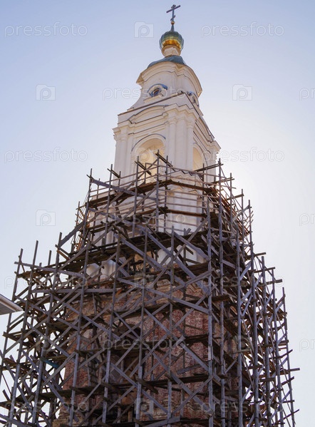 Православная церковь на реставрации на фоне голубого неба