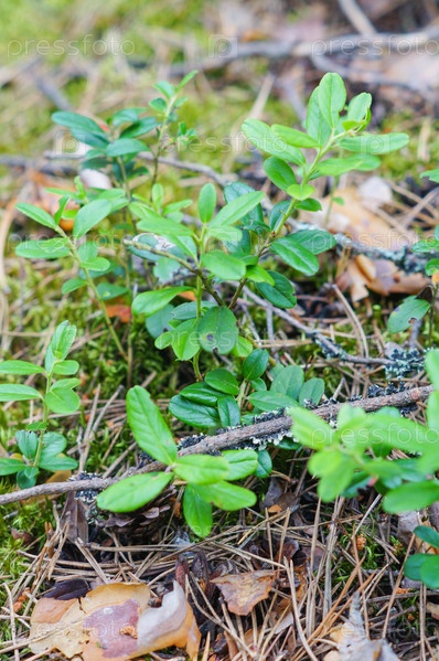 Листья брусники. Красивый фон с зелеными листьями брусники