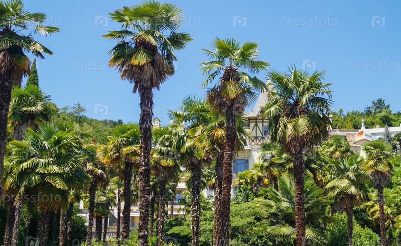 Пальмы в летний день европейского города с голубым небом