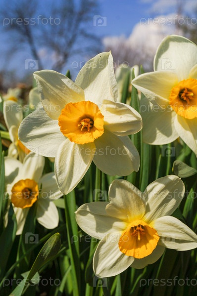 Красивые весенние цветы нарциссы на фоне голубого неба