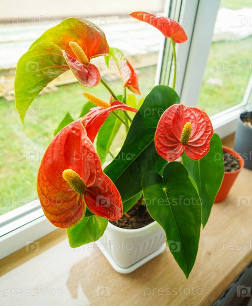 Антуриум в цветочном горшке на подоконнике
