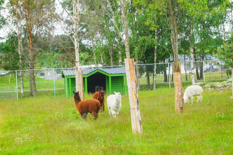Коричневые и белые альпаки в зоопарке Карелии